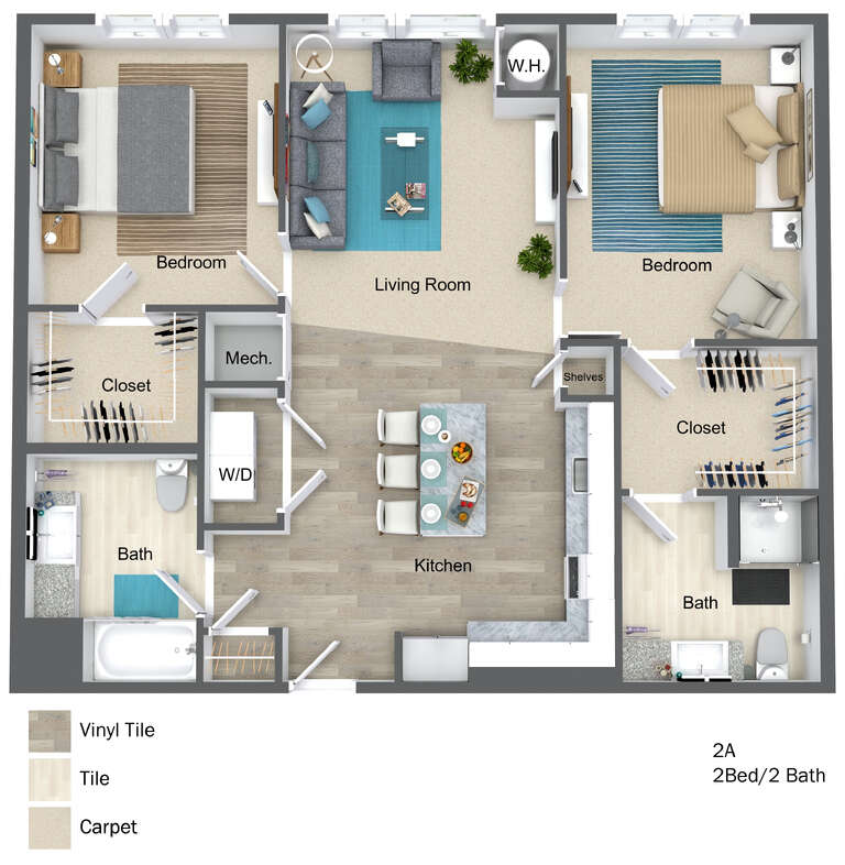 2 bathsView PricingTwo bedroom homes feature an open-concept living space, ample closet space in each bedroom, and in-home laundry.